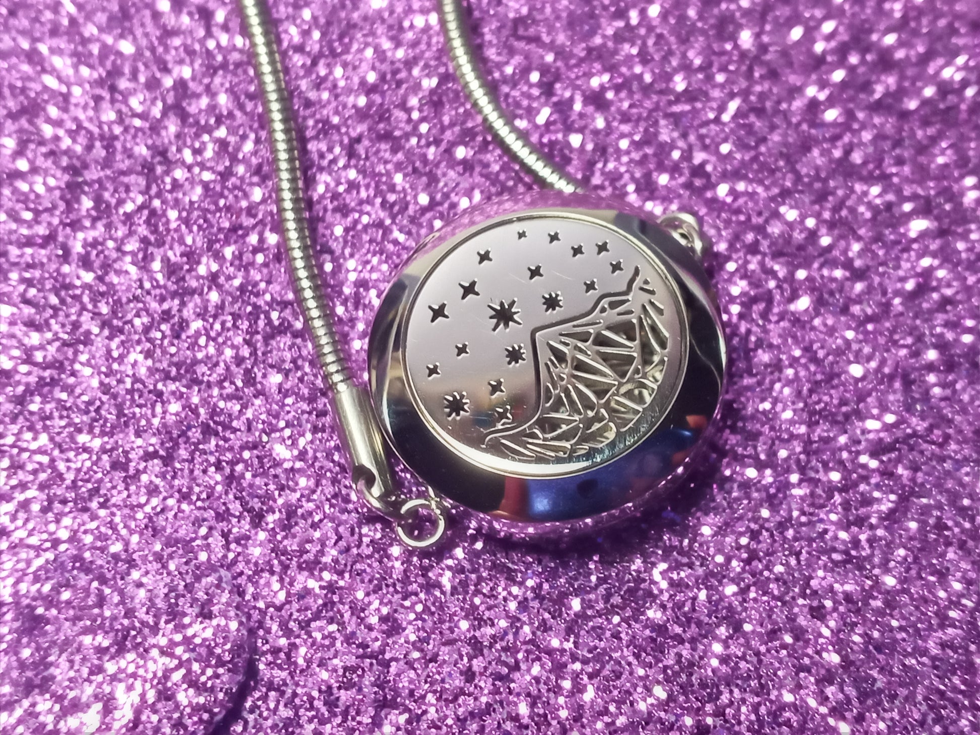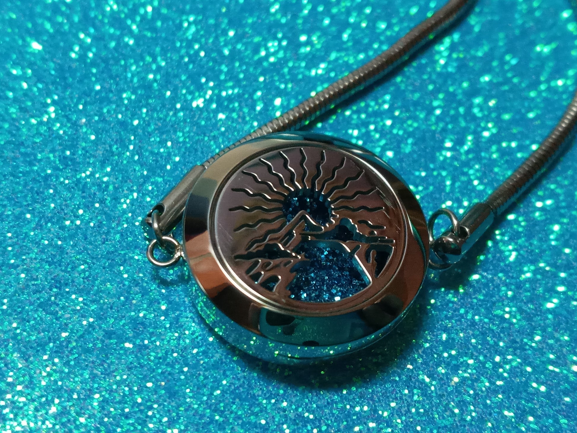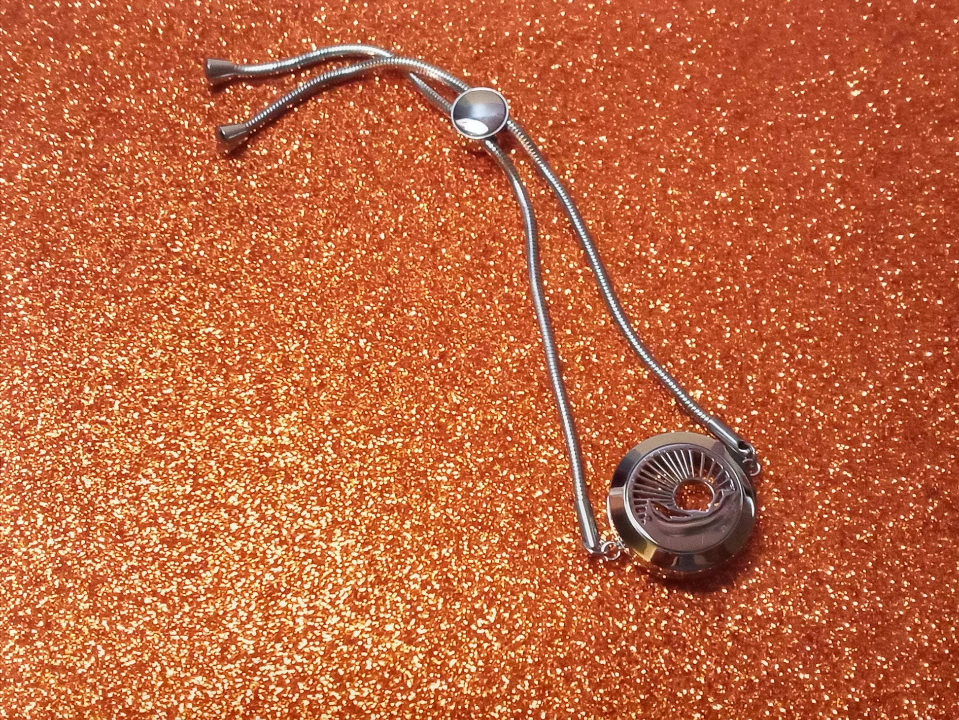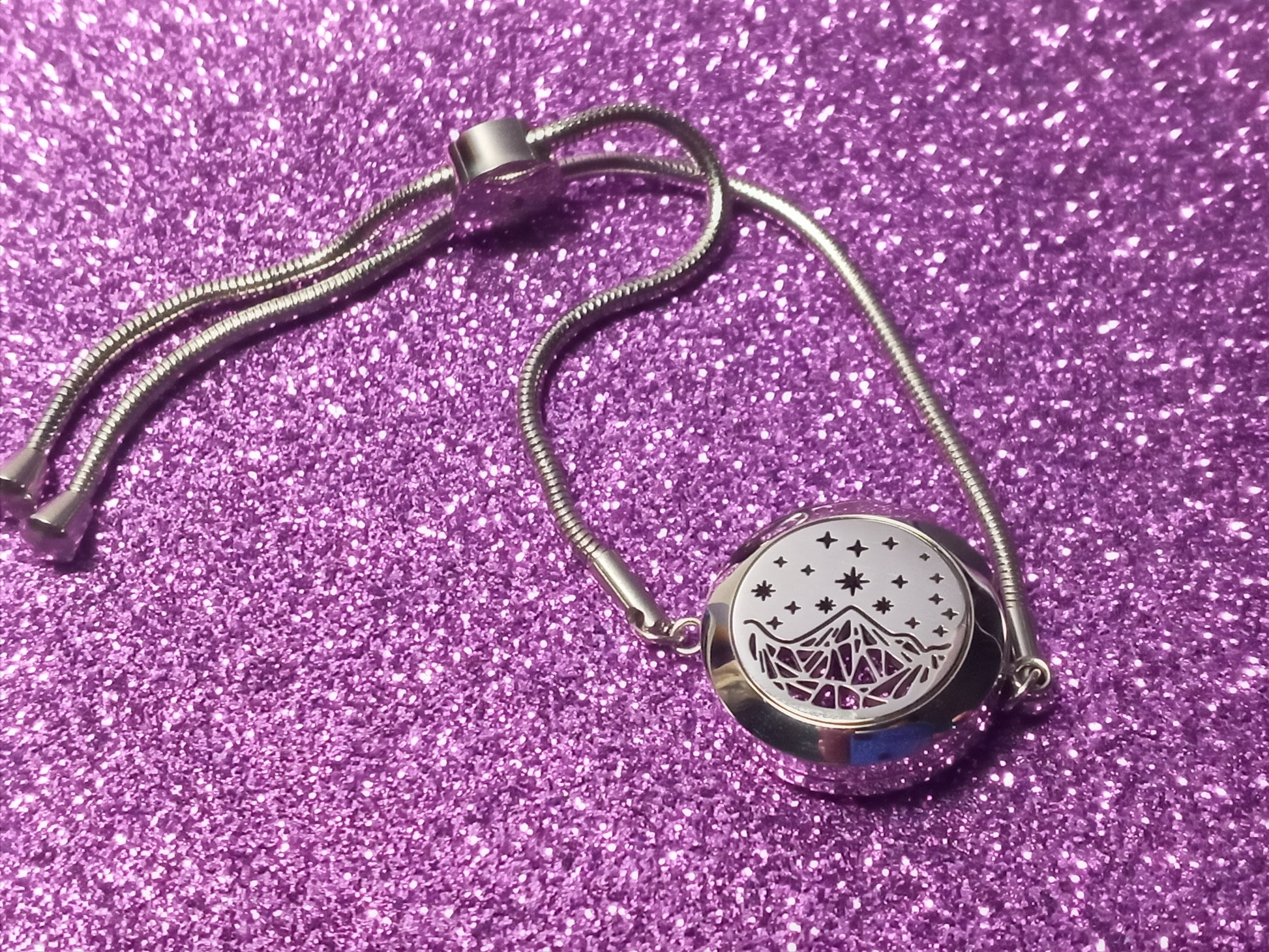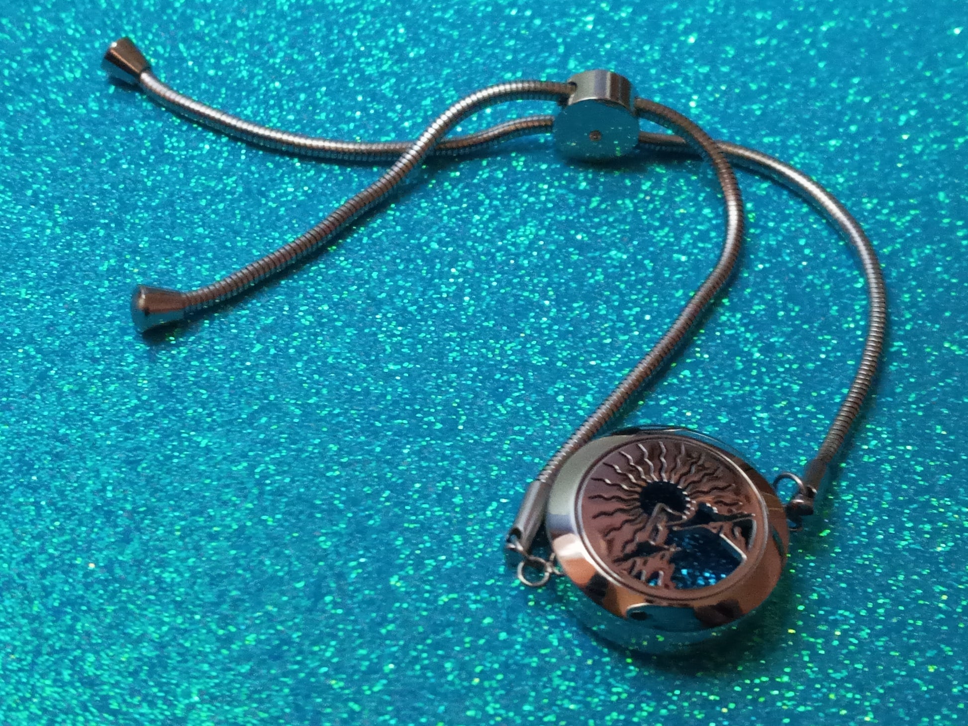 This is a stainless steel oil diffuser bracelet, it has a 25 mm wide locket that opens so you can place inside a felt pad (included) and add drops in it of your favorite essential oils, the locket is kept closed by 2 strong magnets. It also features an adjustable chain of 4.9 inches / 12.50 cm, so you can choose how tight or loose you want to wear it. The bracelet is 5.3 inches / 13.5 cm long in total.