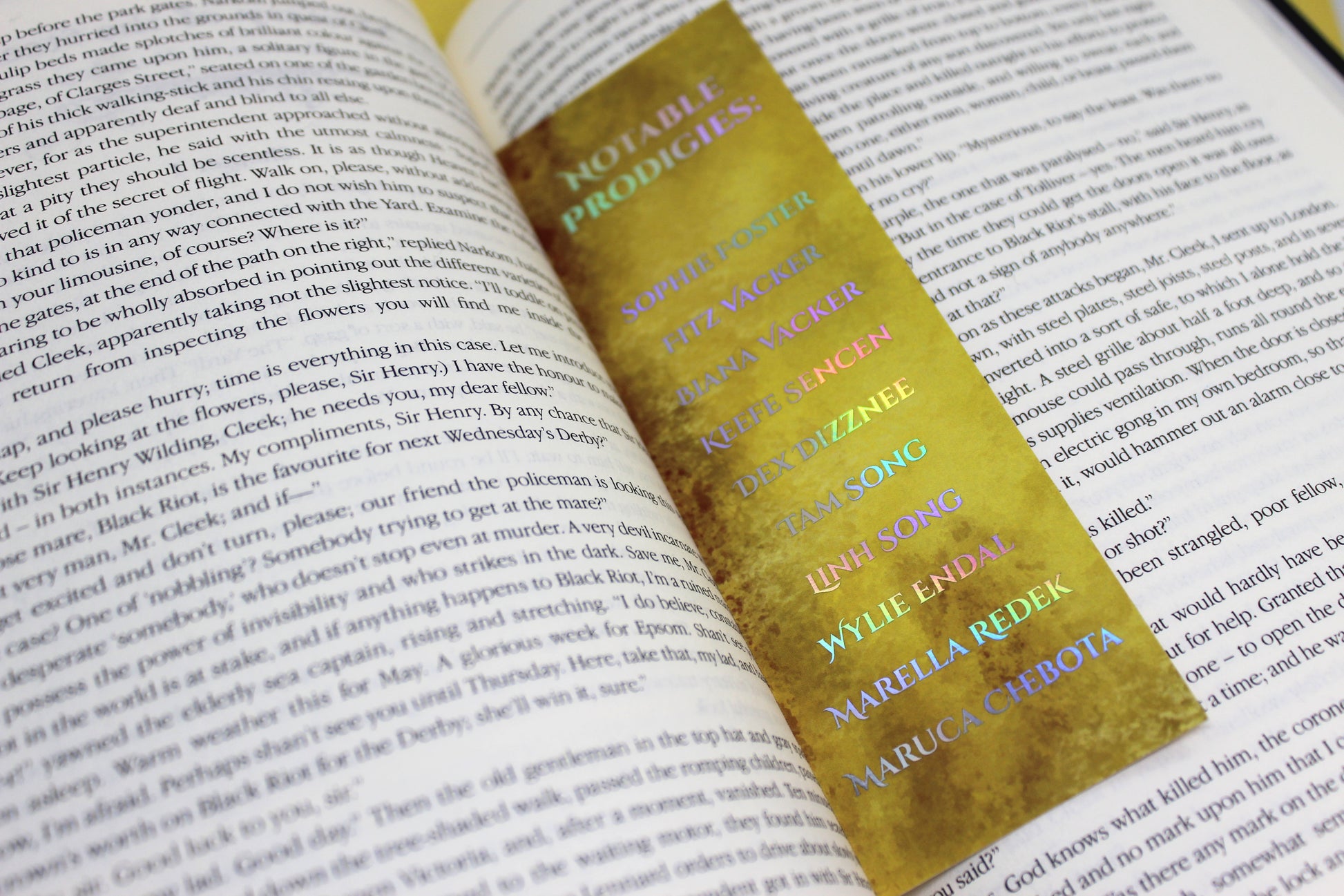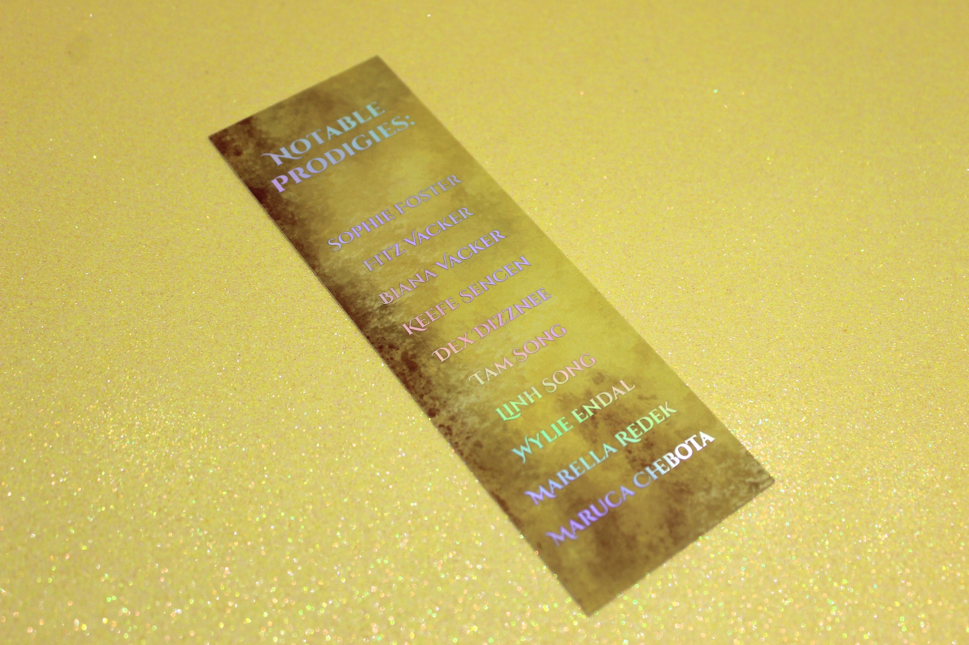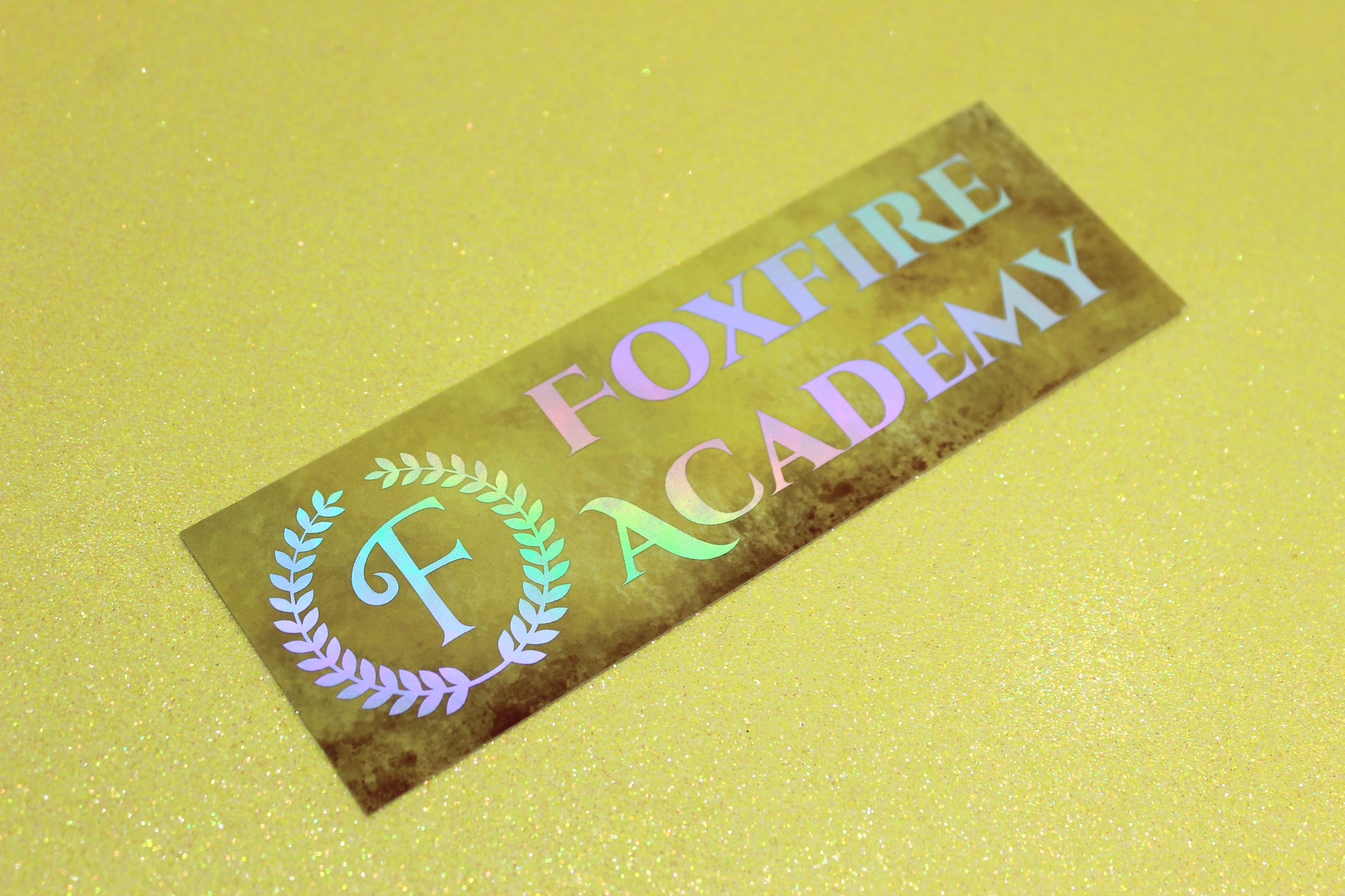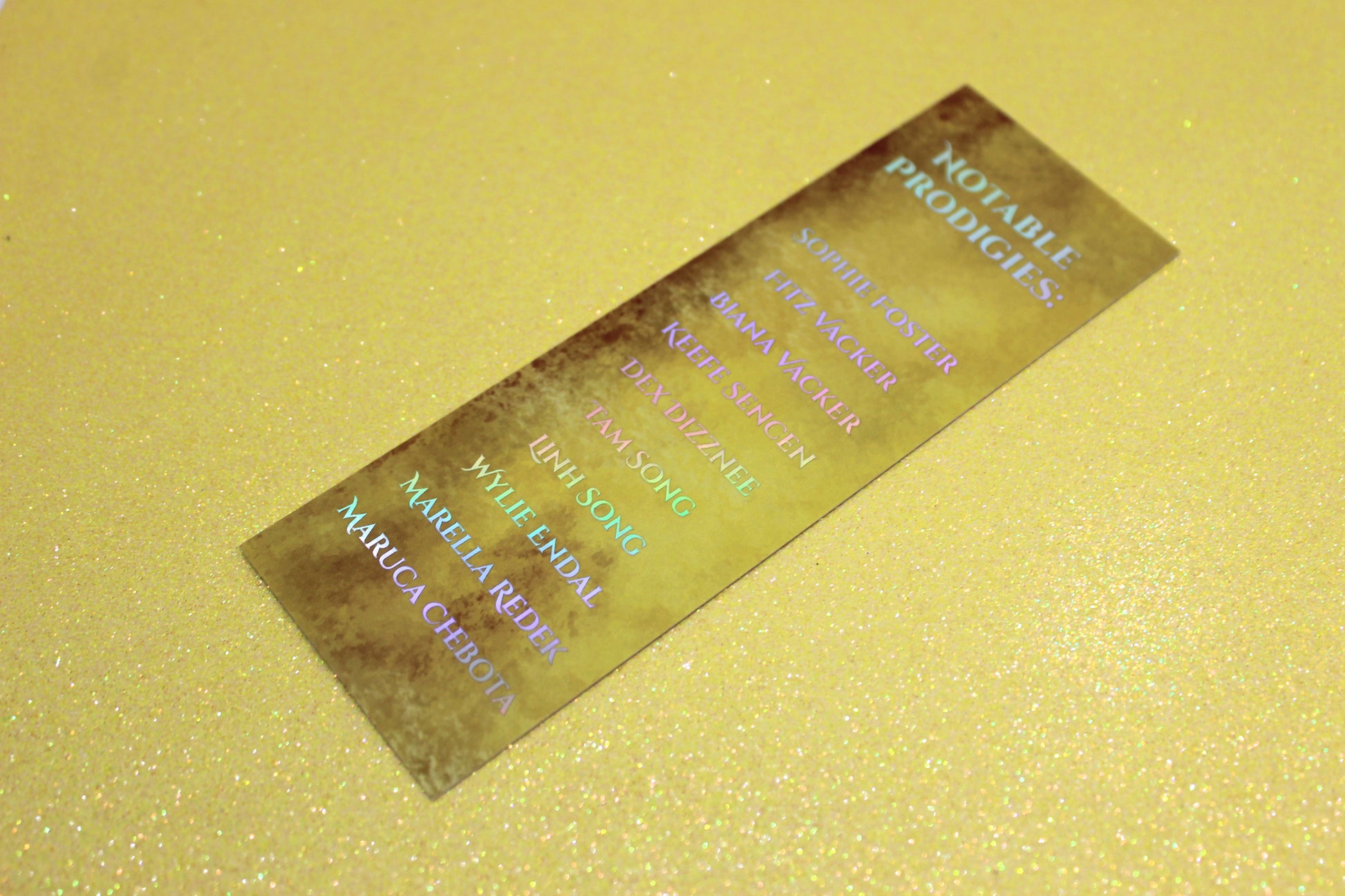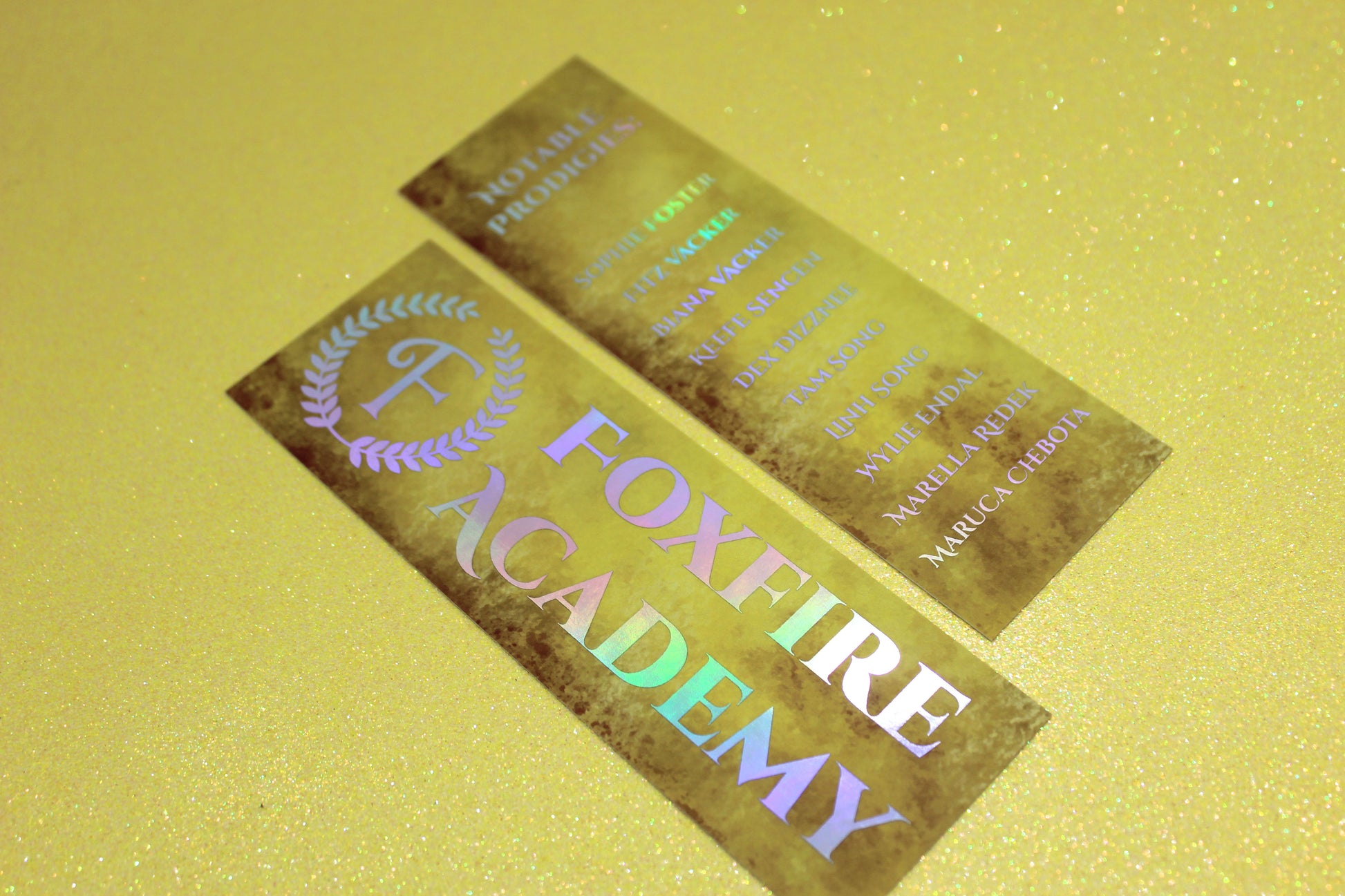 This double-sided bookmark features the Foxfire Academy emblem on the front and a list of notable prodigies on the back — a perfect keepsake for fans of this magical school within the KOTLC world.