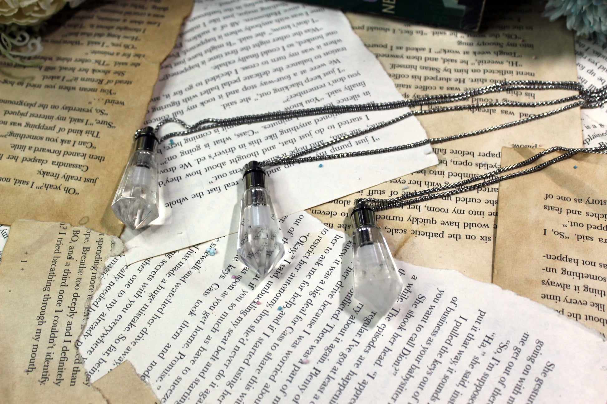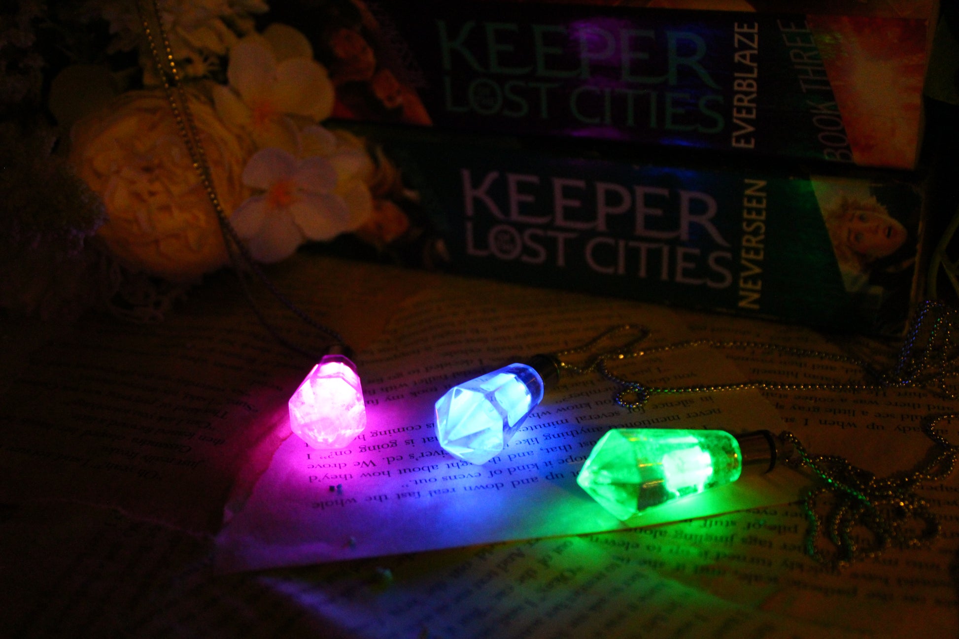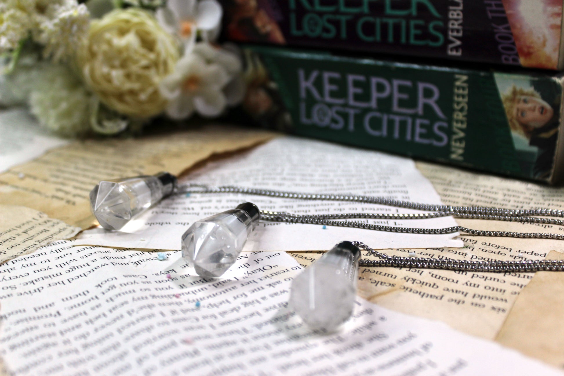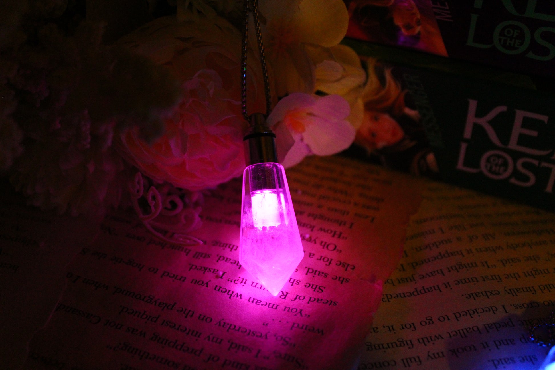 Inspired by the Keeper of the Lost Cities leaping crystals, all crystals are clear quartz with a LED that turns on by twisting the top part.