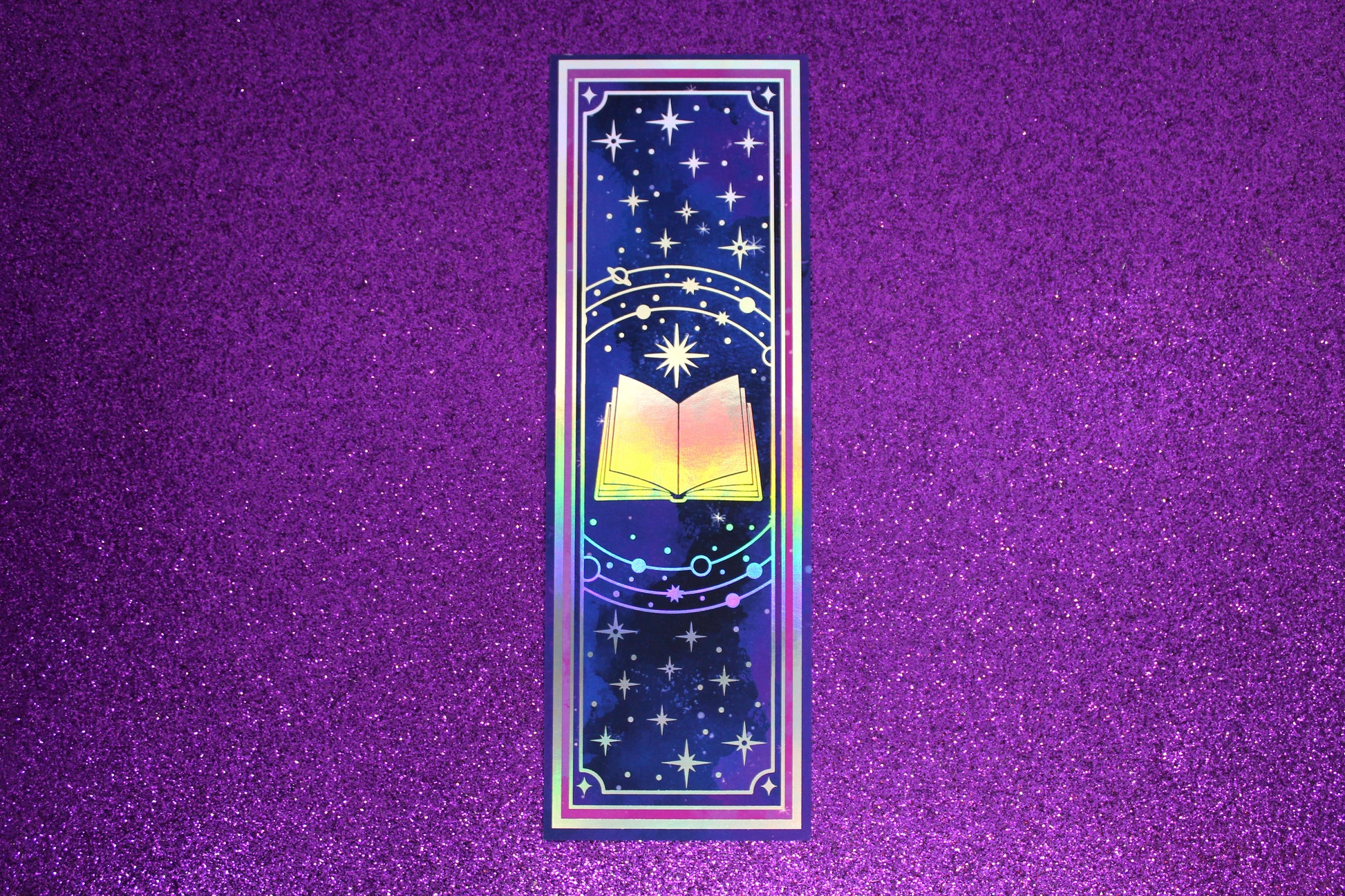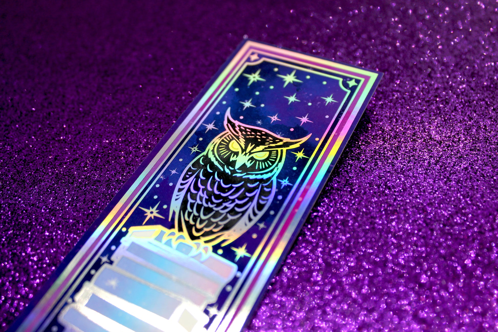 This double-sided bookmark features a stunning owl standing on a pile of books designed inspired by classic tarot elements, enhanced with holographic foil on both sides to create a luminous shimmer that changes with the light.