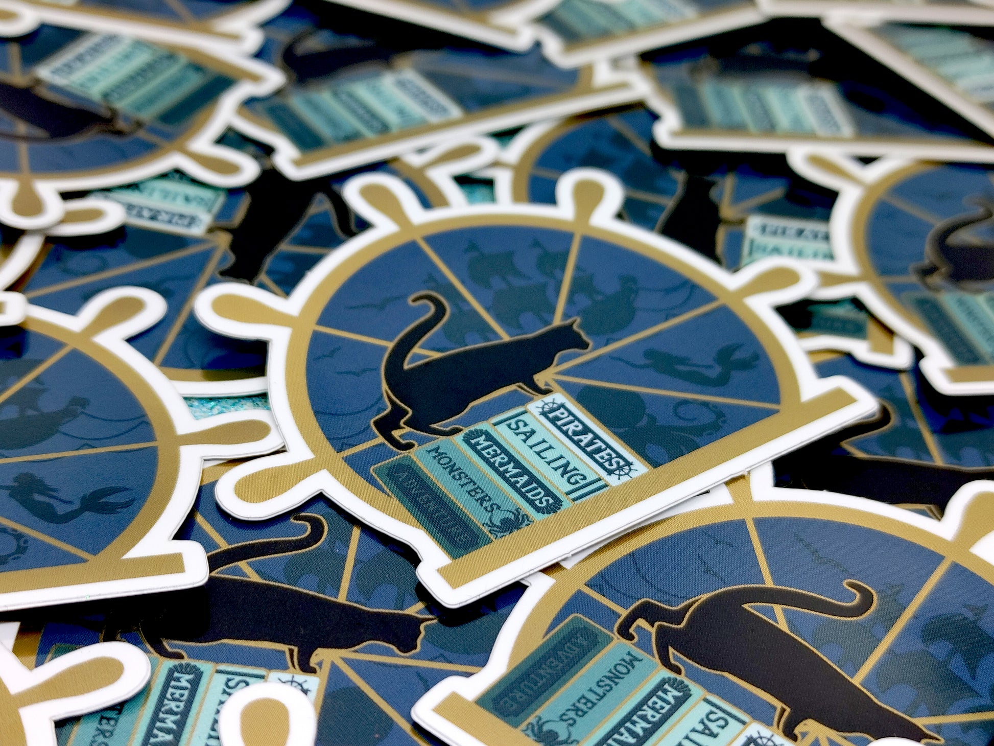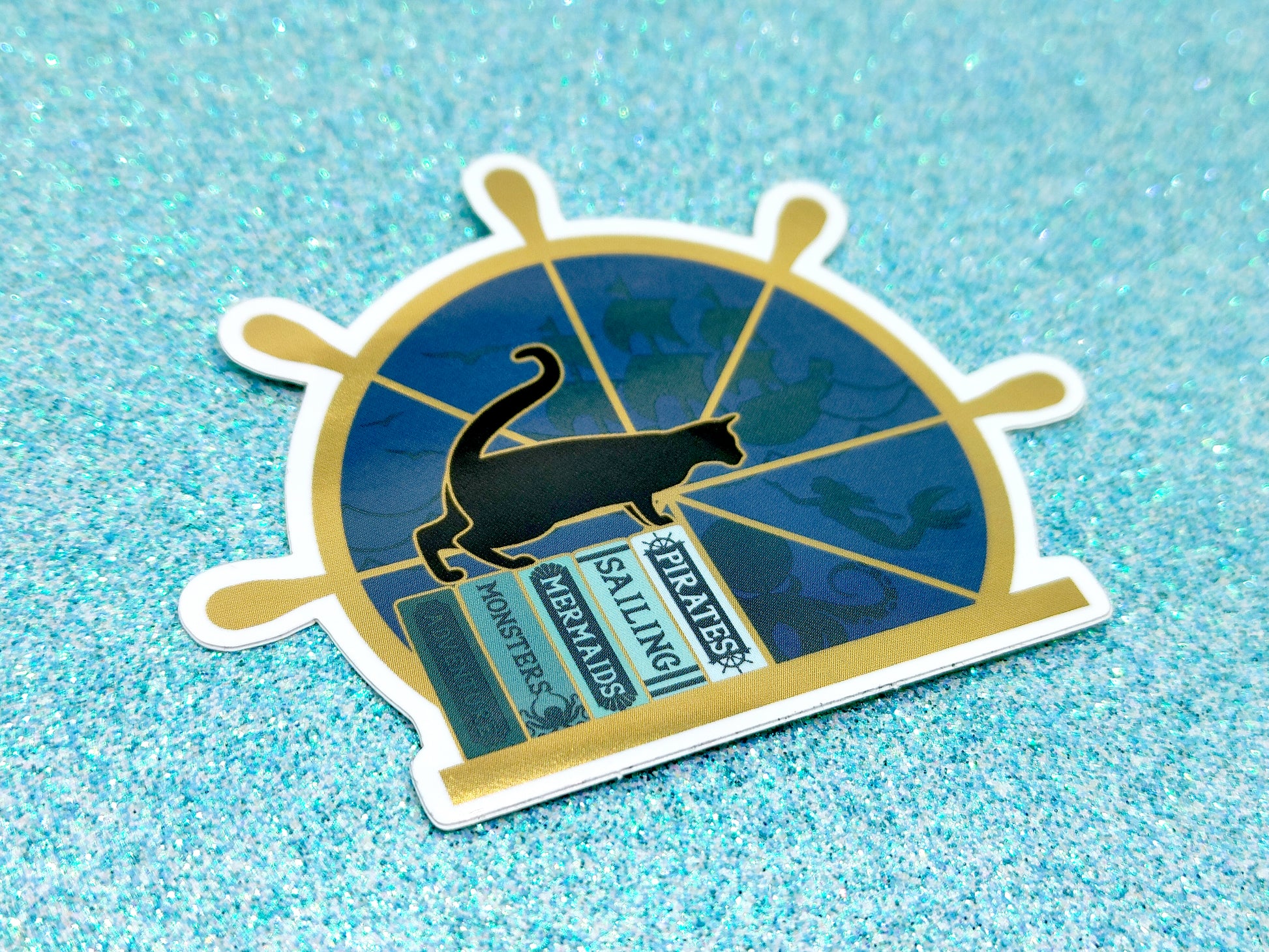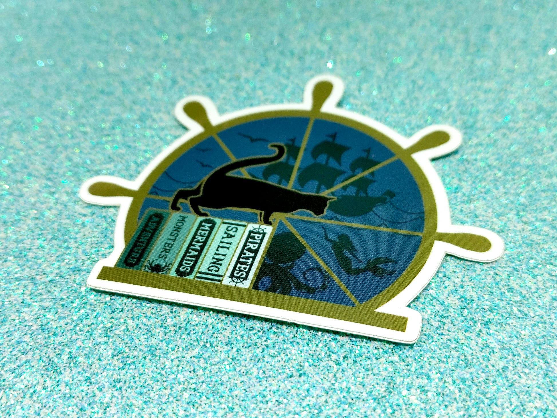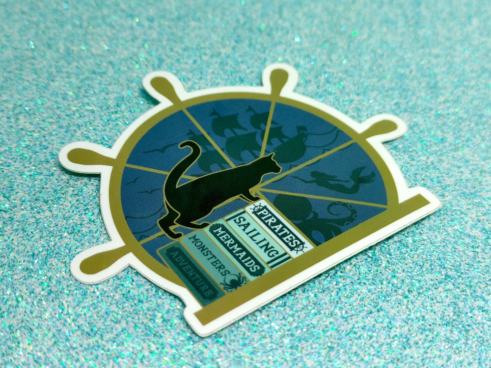 Designed to look like a ship’s wheel-shaped window with a curious cat, this unique mirror vinyl sticker celebrates the magic of sea-bound stories and ocean-inspired tales.