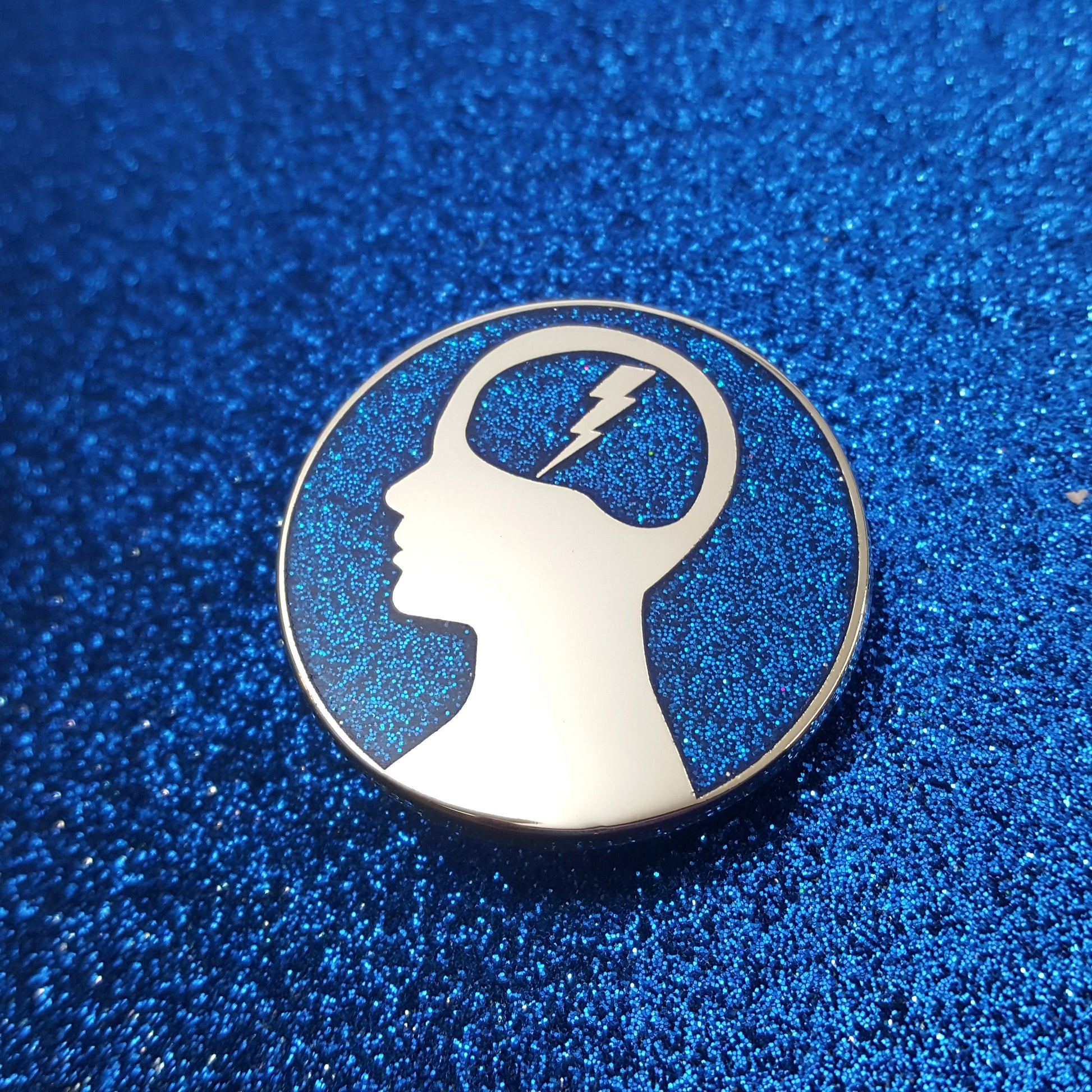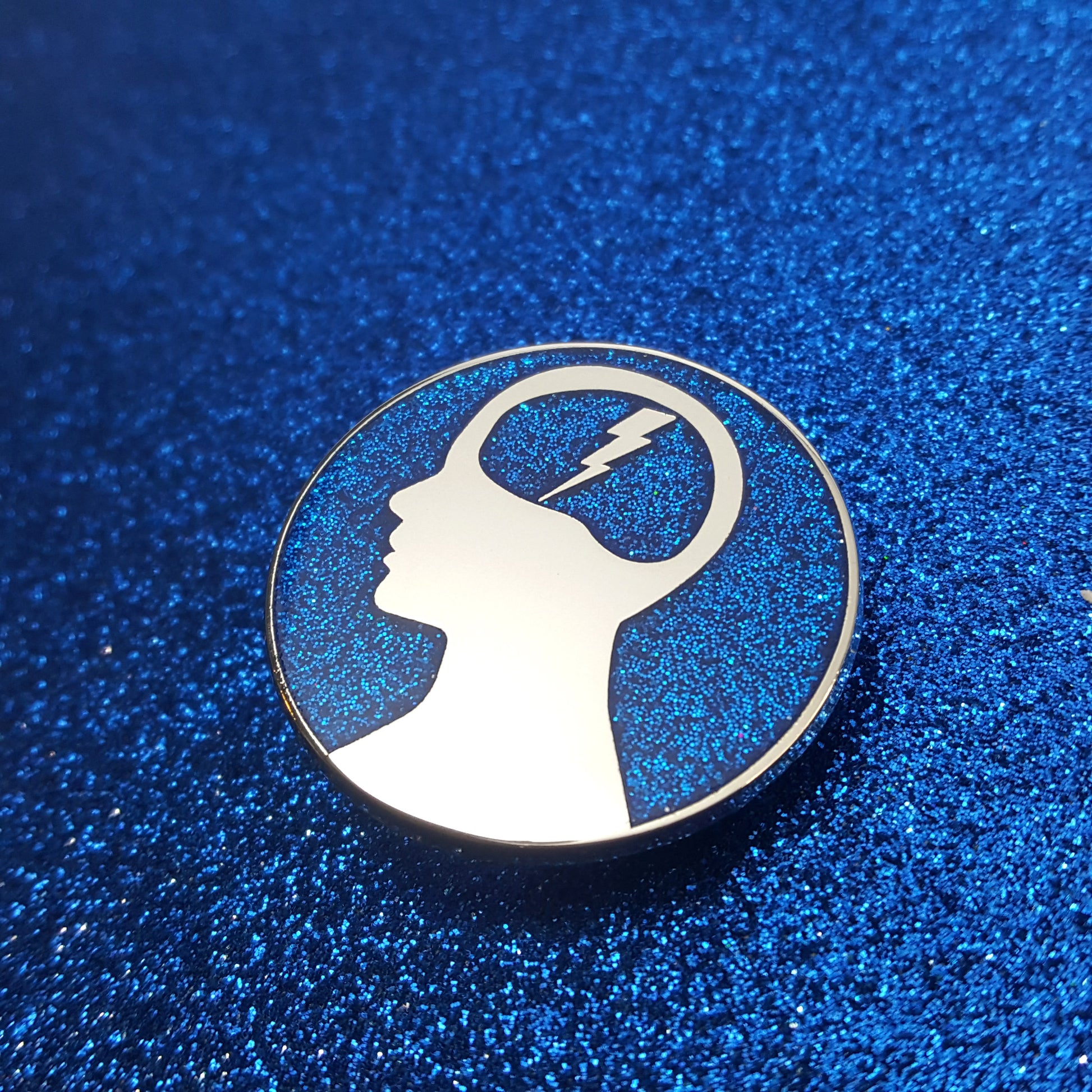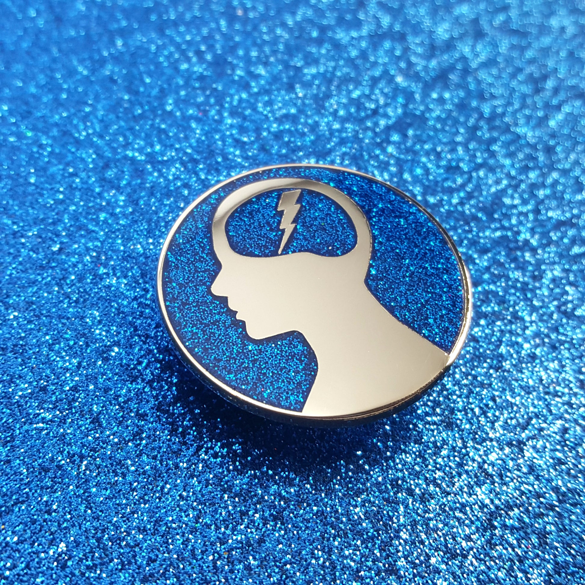 Silver plated hard enamel pin with iridiscent glitter. Two backing posts and default rubber clutches.
