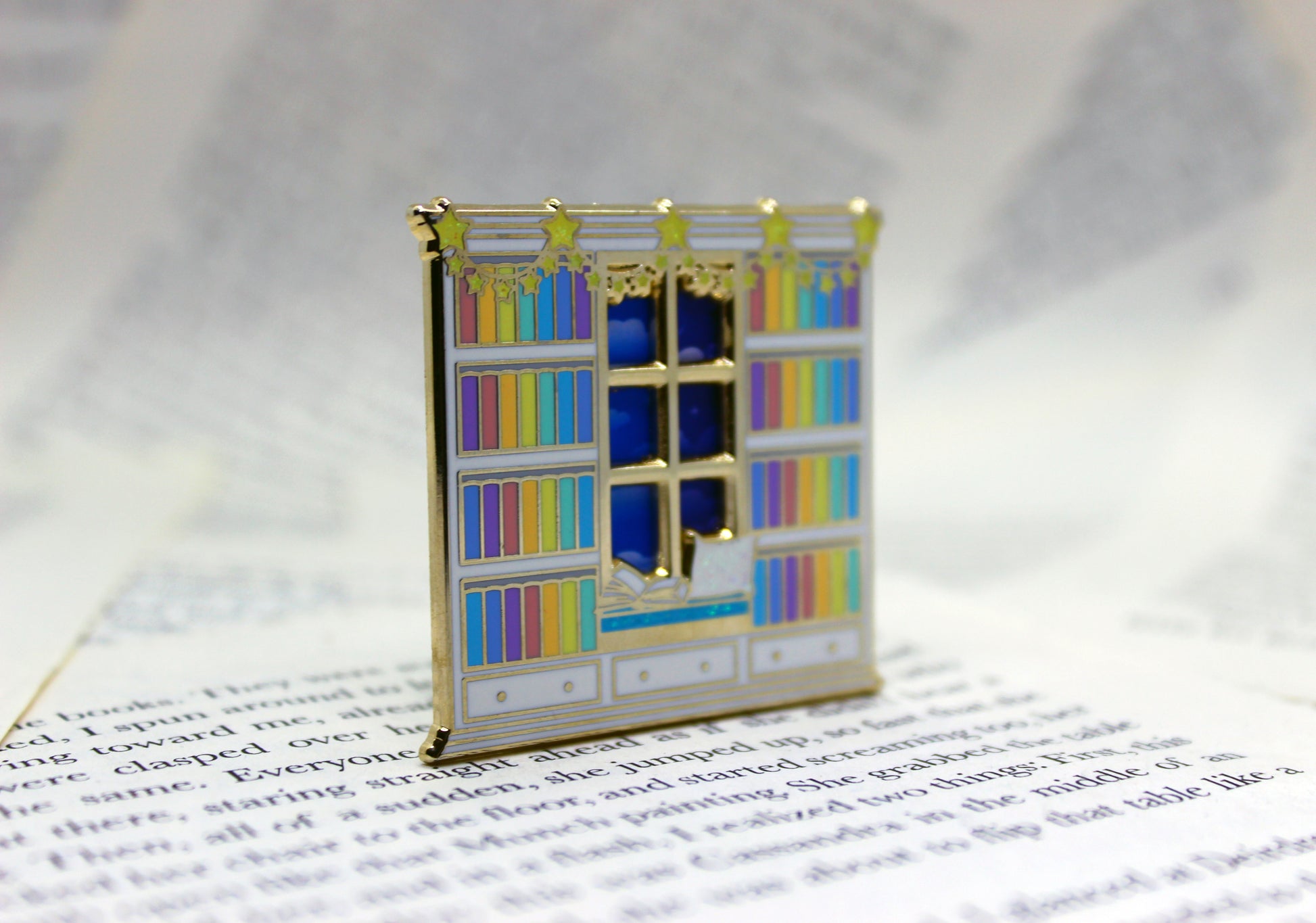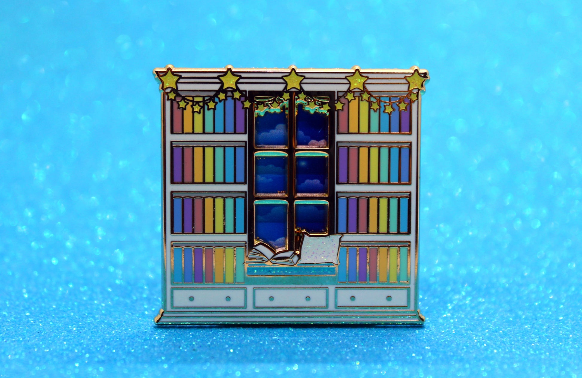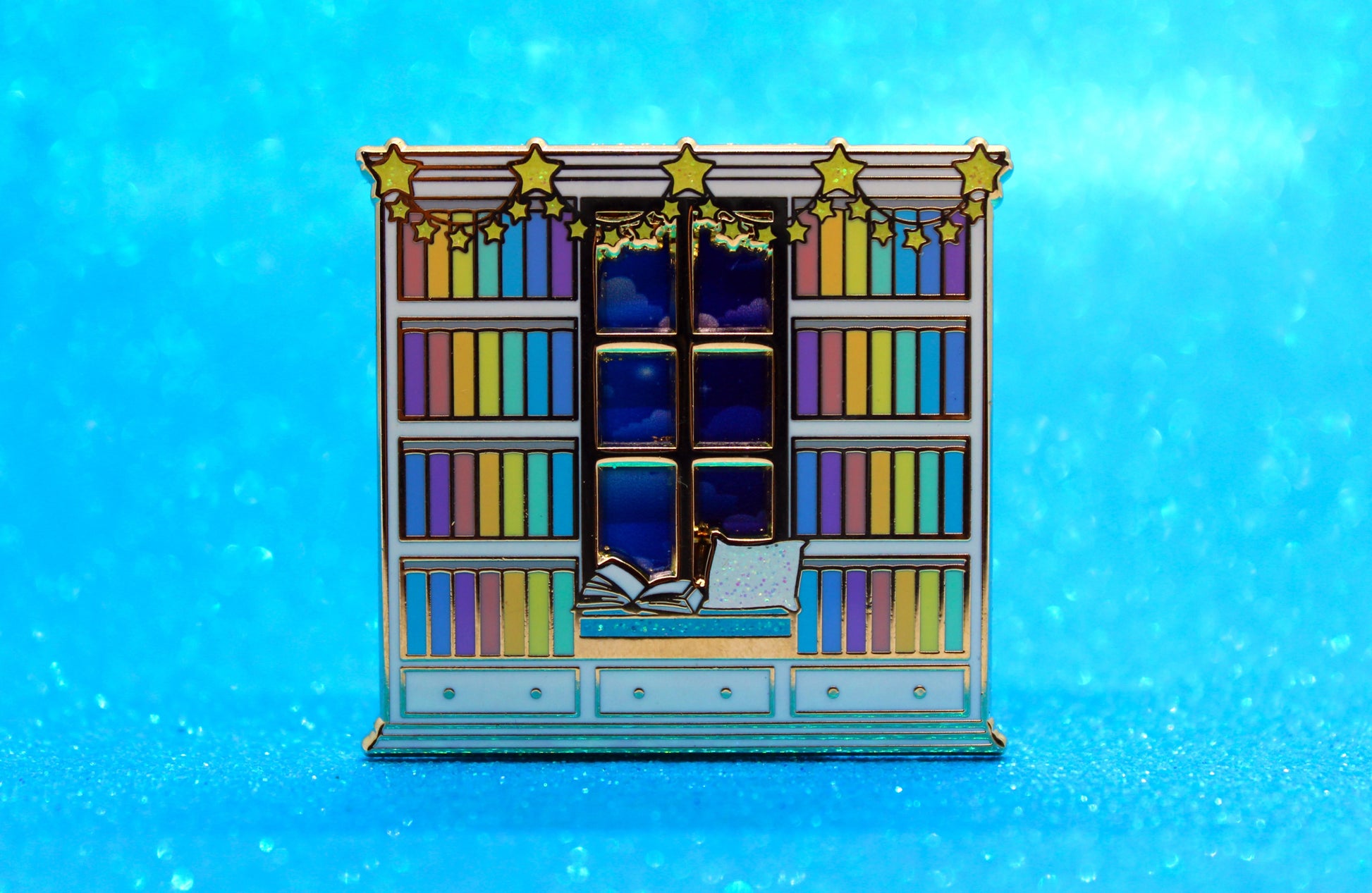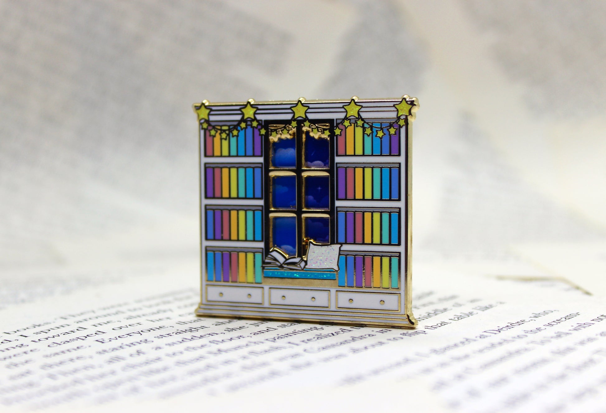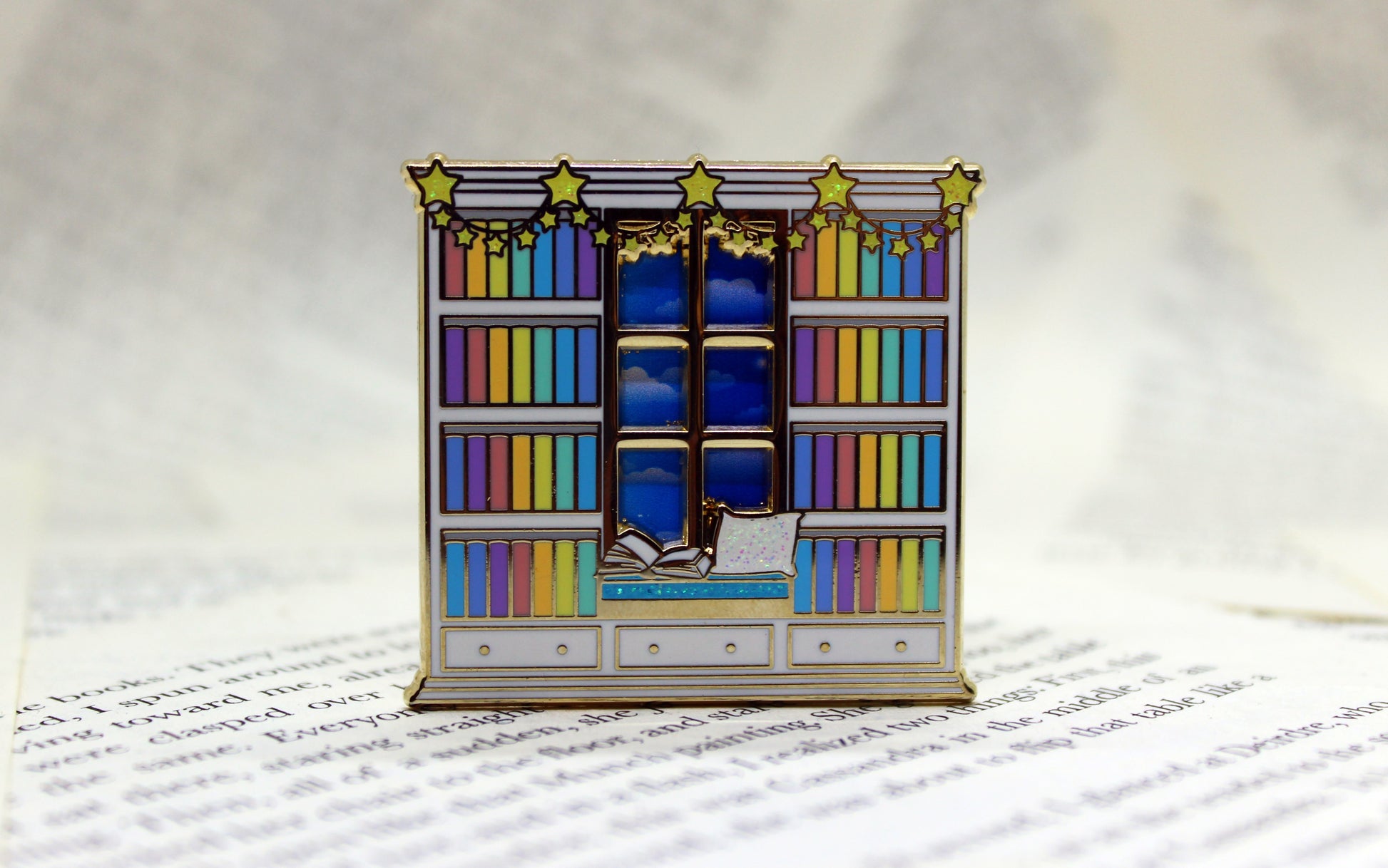 Show proudly your love for books with this rainbow bookshelf sliding enamel pin in pastel colors. Perfect gift for any bibliophile!