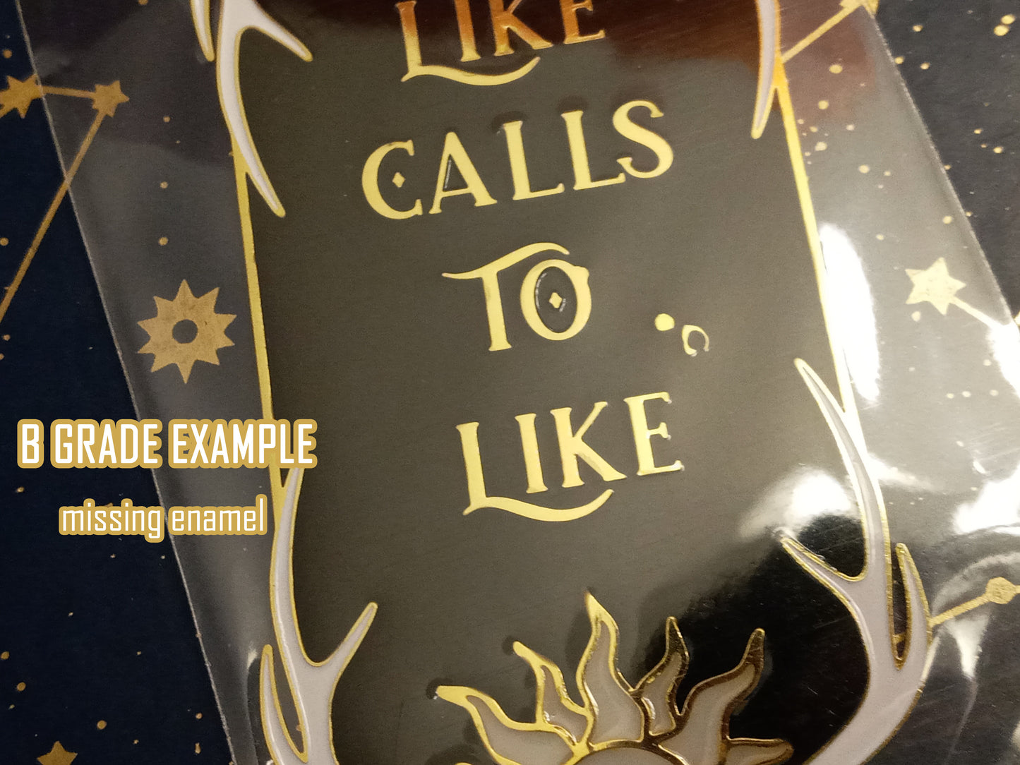 ♦B grade: means it has some flaws in the enamel like little dents, specks of dust or lines (mostly noticeable with direct light and at certain angle like in the picture), missing enamel in small sections or a bit of overflowing enamel in some parts.