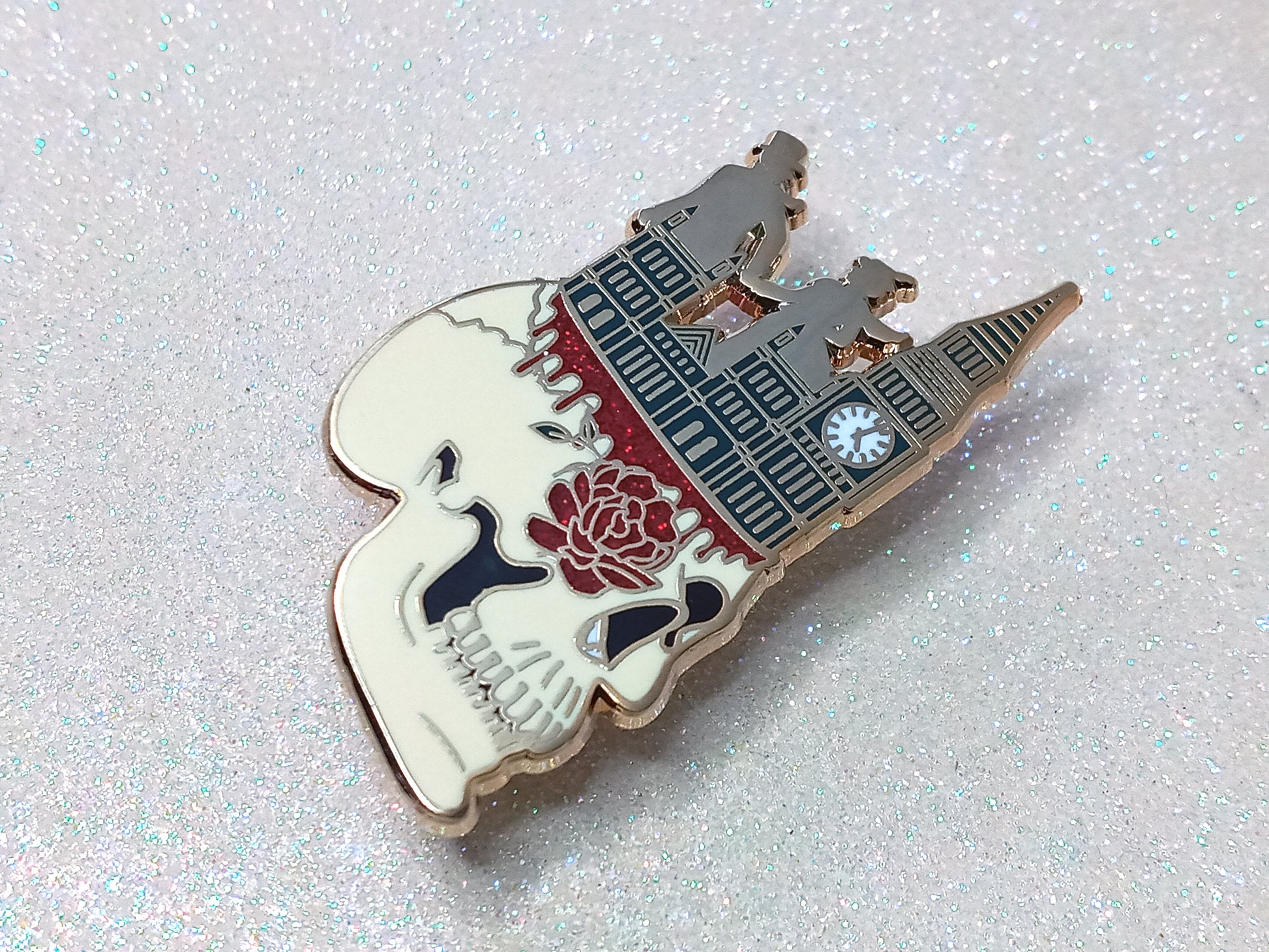 This is a 1 x 2 inches / 2.54 x 5.08 cm hard enamel pin with gold plating. It has glitter in the rose and blood. It has three back posts and black rubber clutches.