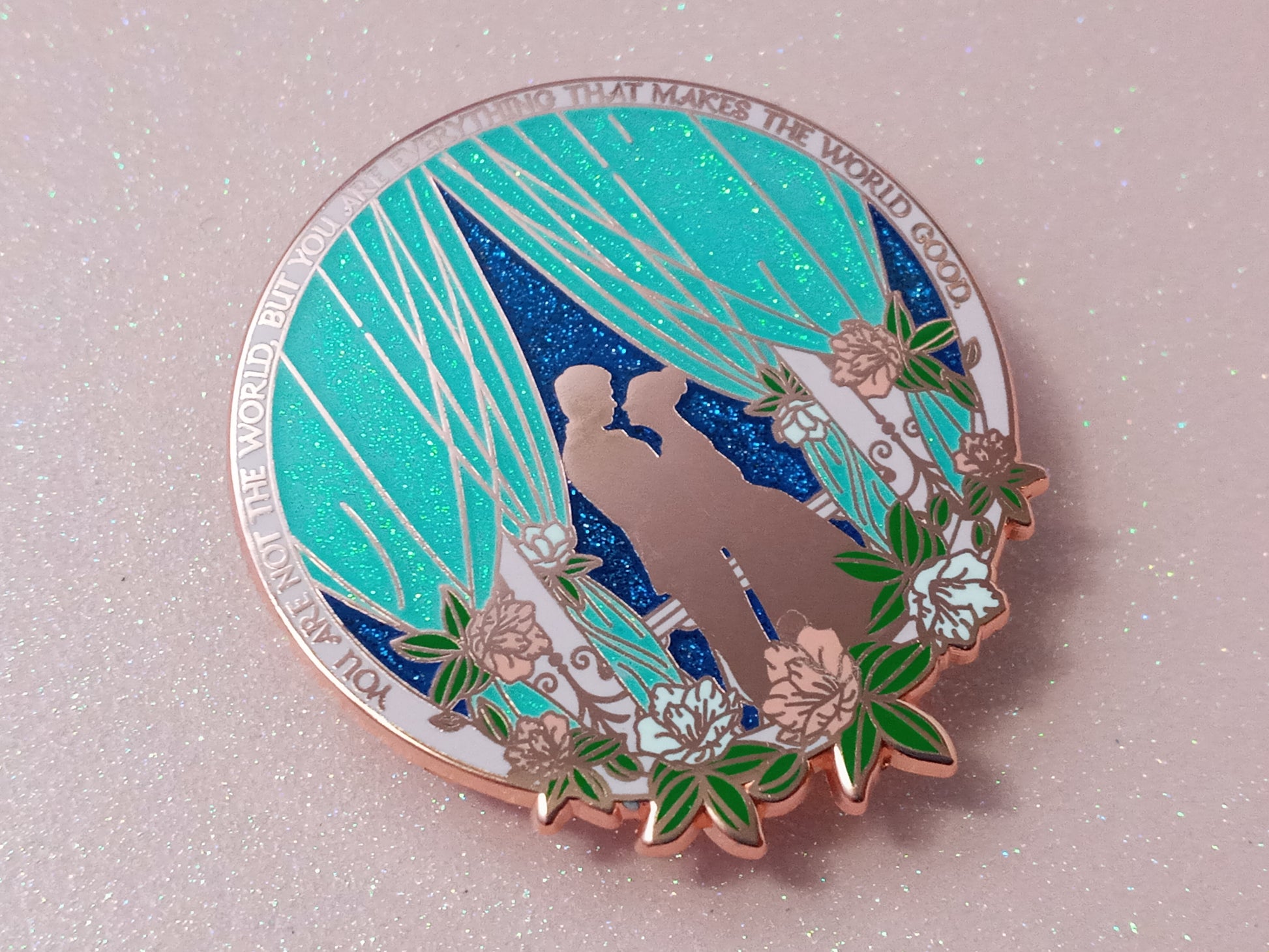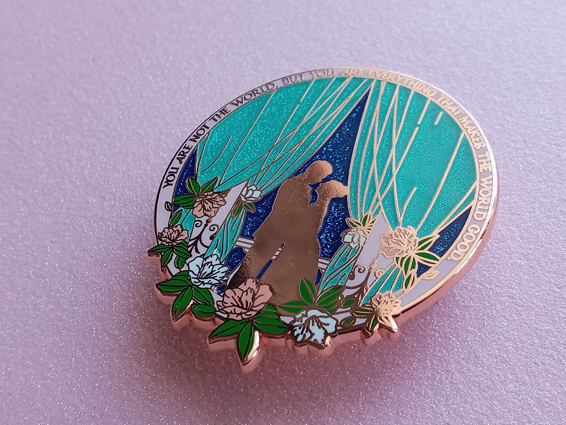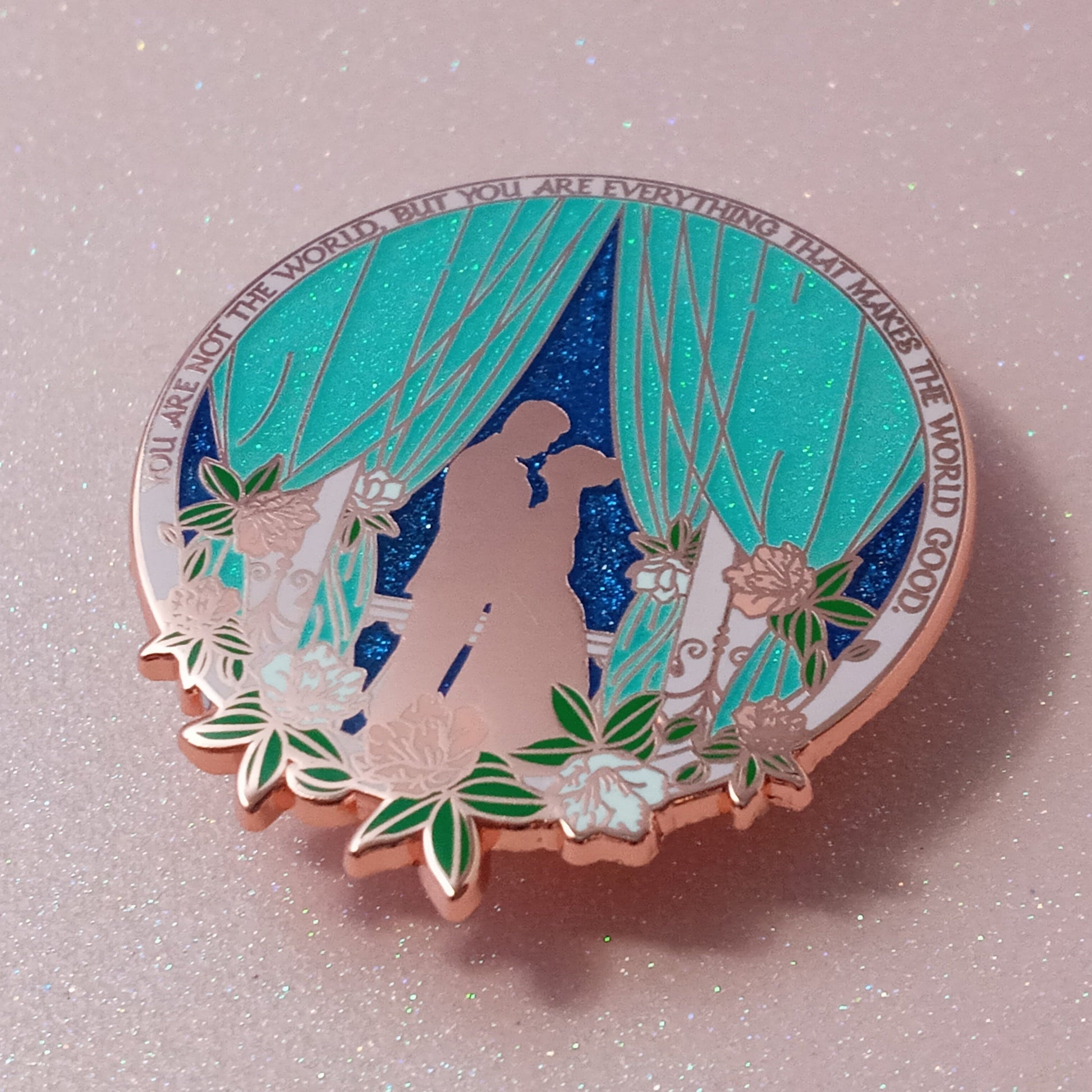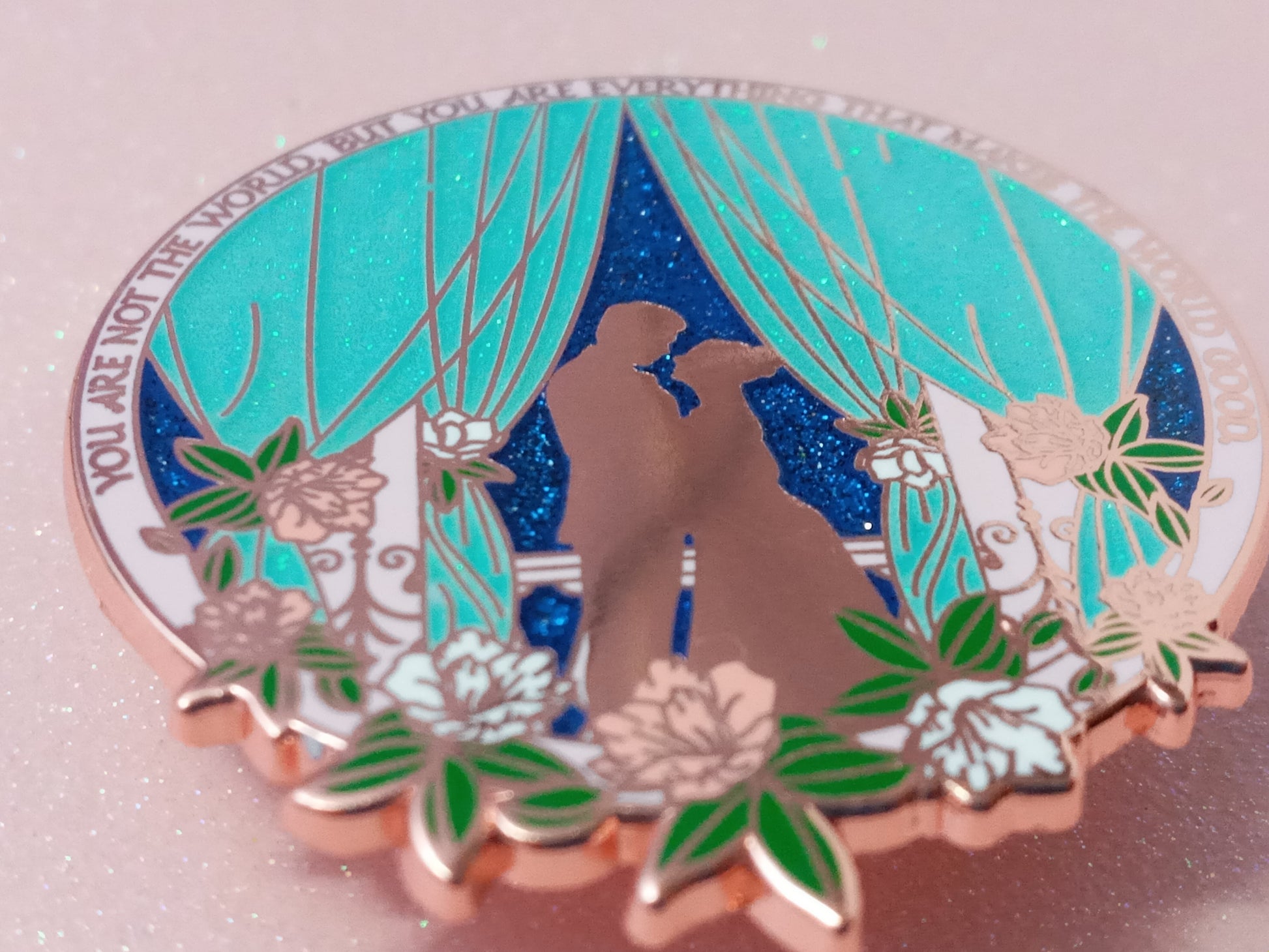 This is a 2 x 1.8 inches / 5.08 x 4.57 cm hard enamel pin with copper plating. It has iridescent glitter in the curtains and blue glitter on the sky.